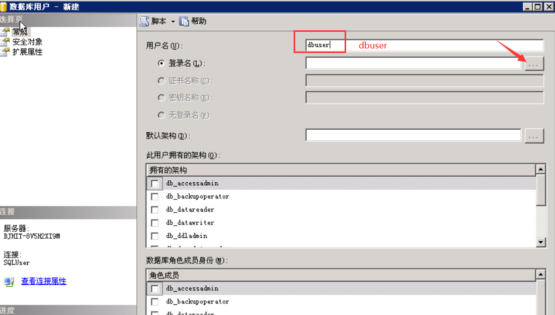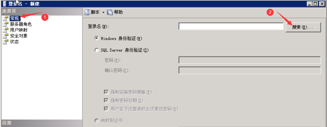 打开SQL Server登录属性对话框。在“常规”选项卡中,单击“名称”输入框右侧的按钮。
