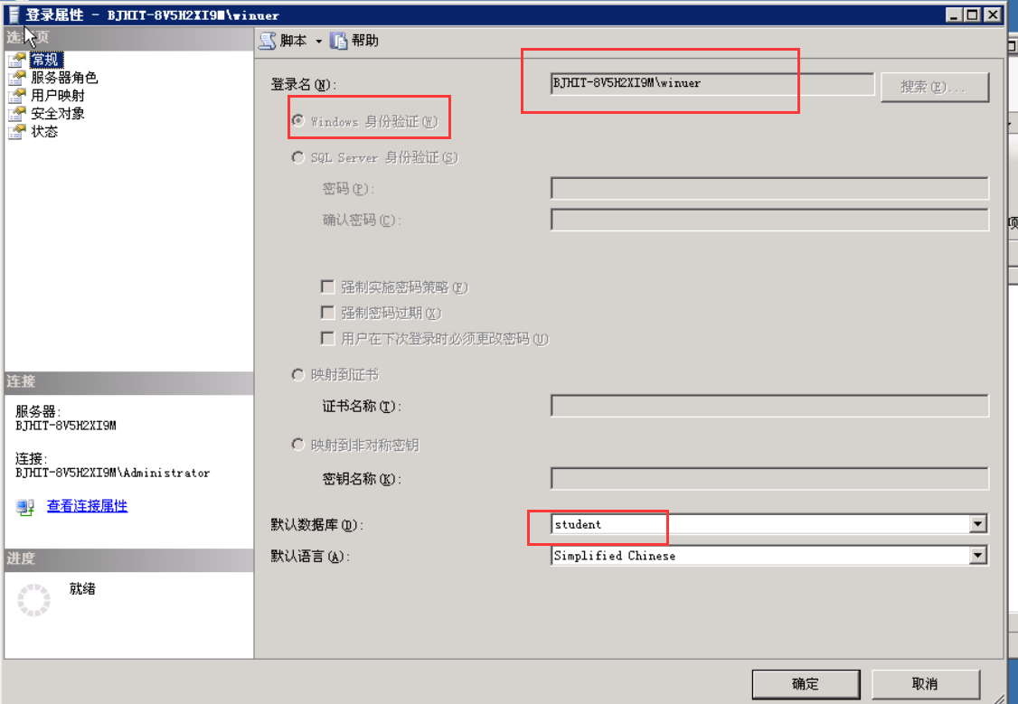 之后, 验证方式选择 “Windows 身份验证”,默认数据库选择student,完成登陆账号winuer的创建。
