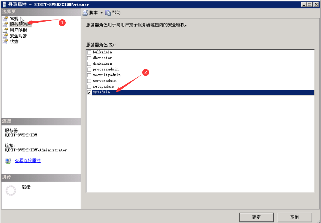 选择“服务器角色”选项卡。可以在服务器角色列表框中选择相应的服务器角色成员。在这里,设置登录用户winuer的服务器角色为系统管理员。