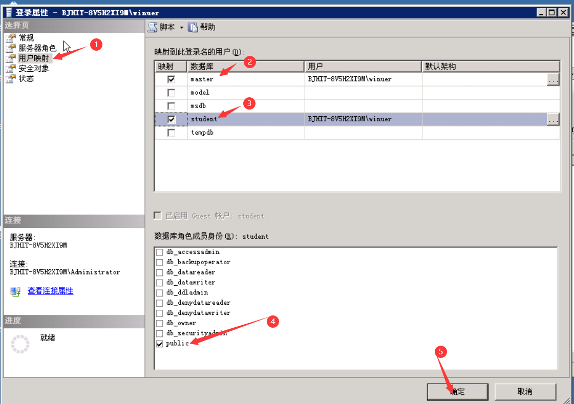 选择“用户映射”选项卡,在列表框中列出了该账号可以访问的数据库,如果单击数据库左边的复选框,表示该用户可以访问相应的数据库。在这里,选中数据库master和student左边的复选框,表示登陆用户winuer可以访问的数据库为master和student。在下方的数据库角色成员身份都选择public。然后点击确定