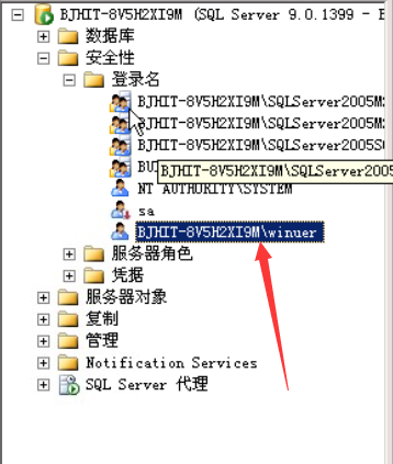 在对象资源管理器中,展开安全性-登录名,可以看到winuer已存在。
