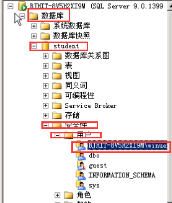 同时,展开数据库-系统数据库-student-安全性-用户,在用户列表中可以看到数据库student中已经建立一个数据库用户winuer。