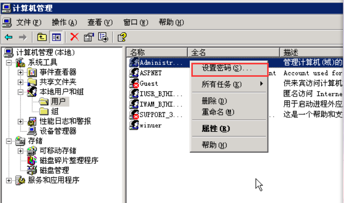 来到桌面,右击我的电脑,点击管理,在计算机管理窗口,依次展开 系统工具-本地用户和组-用户(不会的可参考之前新建winuer时的步骤),在右侧右击administrator,选择设置密码。