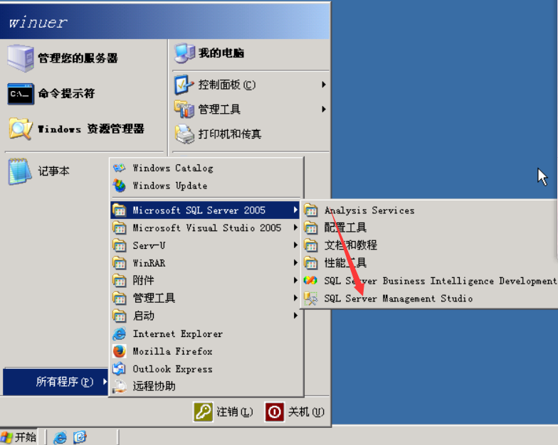 登录后,点击左下角的开始-所有程序-Microsoft SQL Server 2005-SQL Server Management Studio 进入SQL Server Management Studio
