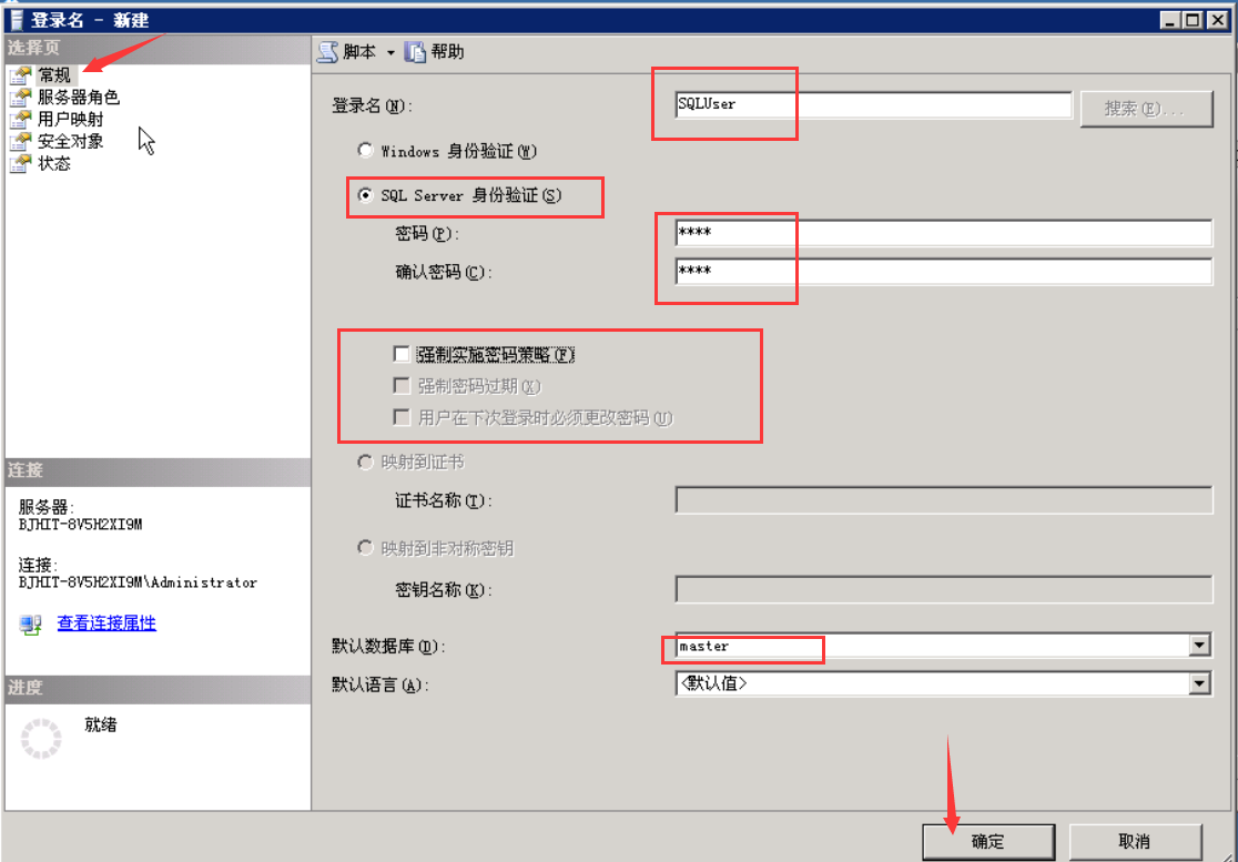 在登录名输入框内输入需要新建的用户名,这里新建的用户名是SQLUser。验证方式选择SQL Server身份验证,然后在密码框输入SQLUser的密码。这里设置成test。把强制实施密码策略的复选框去勾选去掉,默认数据库选择master,然后点击确认