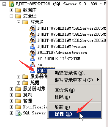 右击新建的SQLUser用户,选择属性