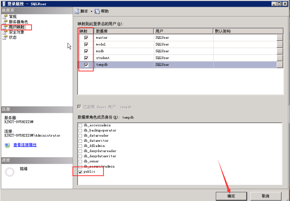 单击“用户映射”,在“映射到此用登录名的用户”中,将所有数据库都选中,下方的数据库角色成员身份全部选择public,然后单击确定完成账号的创建。