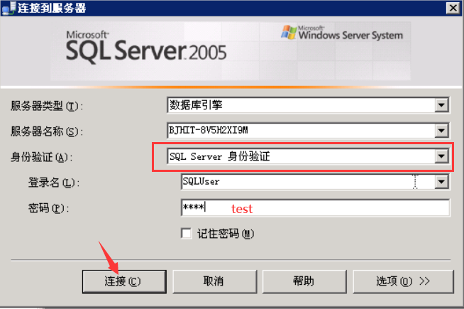 关闭SQL Server Management Studio重新打开,在登录页面处身份验证选择SQL Server身份验证。然后输入刚才新建的账号和密码,然后点击连接