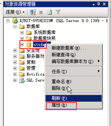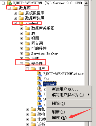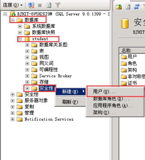 打开SQL Server Management Studio,展开服务器-数据库,选择要创建用户的数据库,如student,展开student,用鼠标右键单击“安全性”节点,从弹出的菜单中选择“新建-用户”命令。