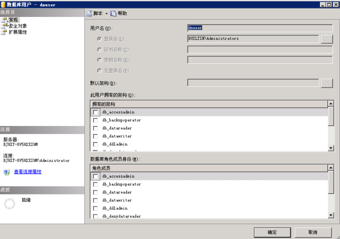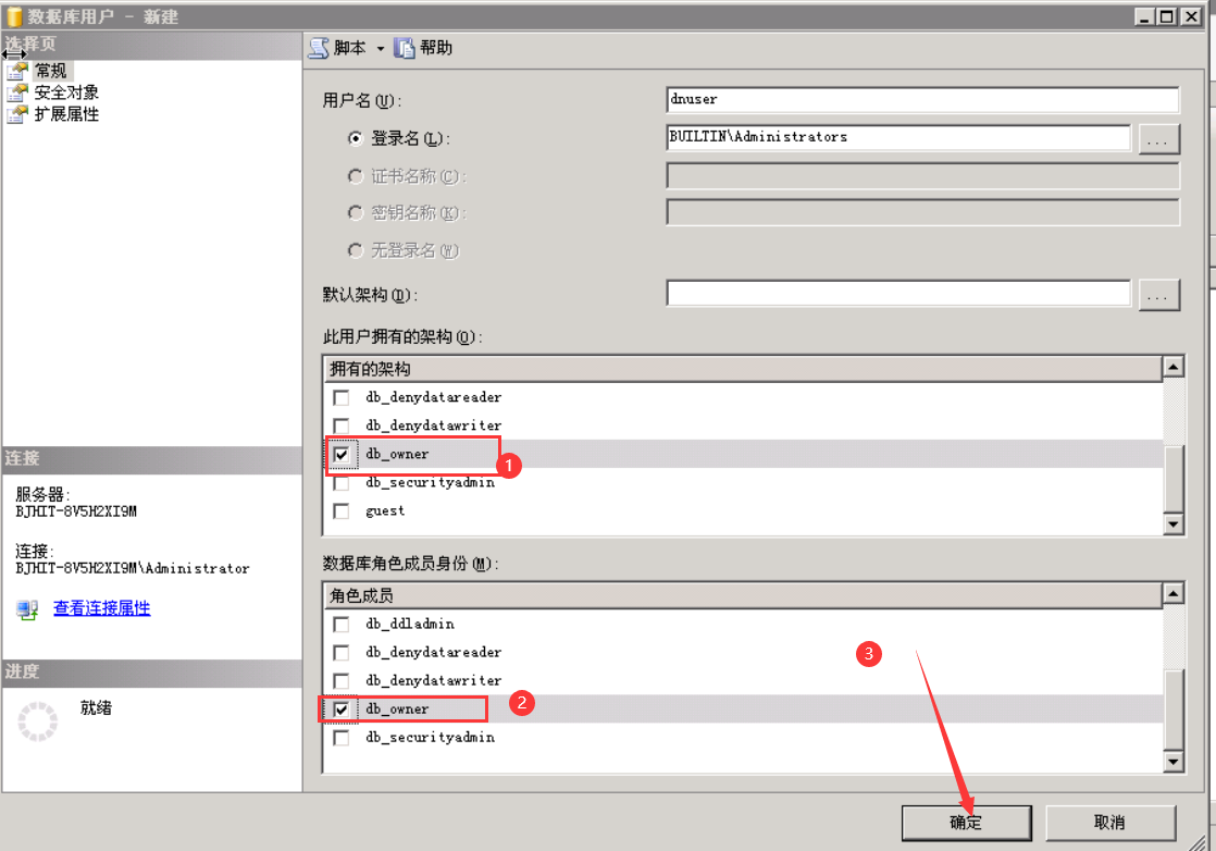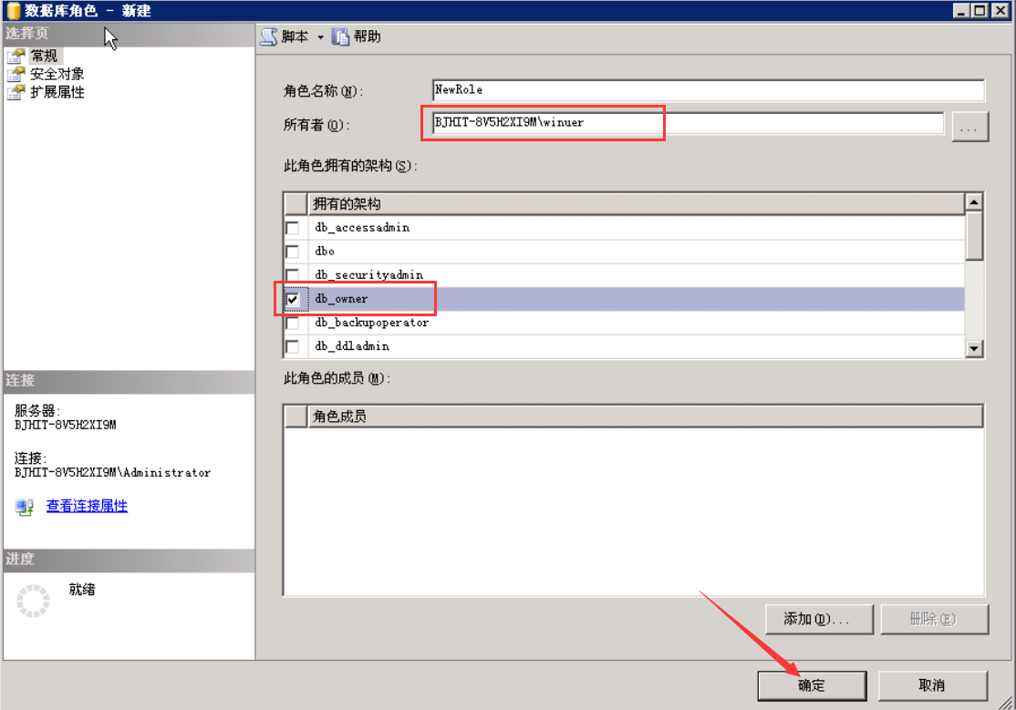 在此角色拥有的架构中选择db_owner,然后点击确定,完成角色创建。