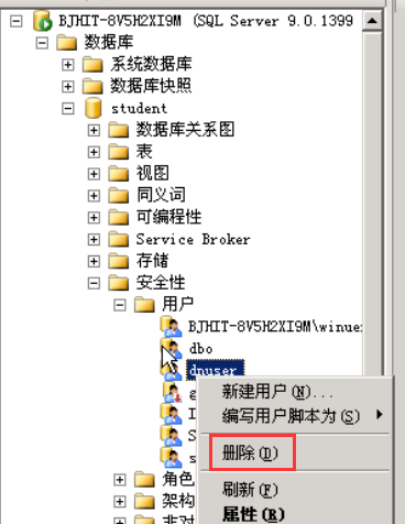 在企业管理器中,用鼠标右键单击要删除的数据库用户,如数据库student中的数据库用户dbuser,从快捷菜单中选择“删除”命令即可