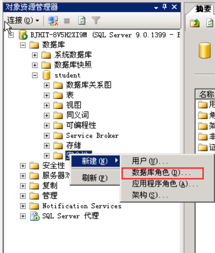 打开SQL Server Management Studio,展开服务器-数据库,选择要创建用户的数据库,如student,展开student,用鼠标右键单击“安全性”节点,从弹出的菜单中选择“新建-数据库角色”命令。