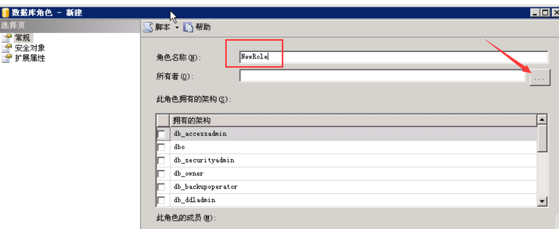 弹出“新建角色”对话框,在角色名称输入框中输入数据库新角色的名称,如NewRole,点击所有者后面的按钮
