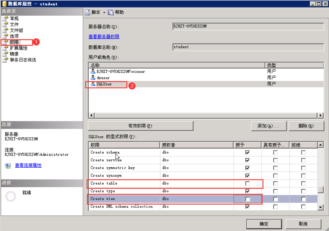 启动SQL Server Management Studio,展开实例数据库,右击student数据库,在弹出的快捷菜单中选择“属性”,然后选择“权限”选项卡。在用户WinUser一栏中,将“创建表”和“创建视图”选中