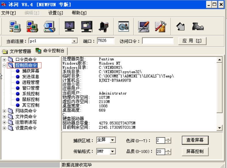 “捕获屏幕”:这个功能可以使控制端使用者查看远程主机的屏幕,好像远程主机就在自己面前一样,这样更有利于窃取各种信息,单击“查看屏幕”按钮,然后就染成了远程主机的屏幕。可以看到,远程主机屏幕上的内容就显示在本机上了,显示内容不是动态的,而是每隔一段时间传来一幅。
