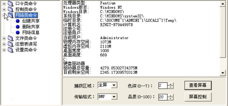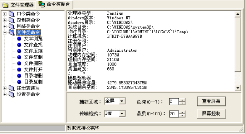 该类命令中,“文件浏览”、“文件查找”、“文件压缩”、“文件删除”、“文件打开”等菜单可以查看、查找、压缩、删除、打开远程主机上某个文件。“目录增删”、“目录复制”、可以增加、删除、复制远程主机上的某个目录。