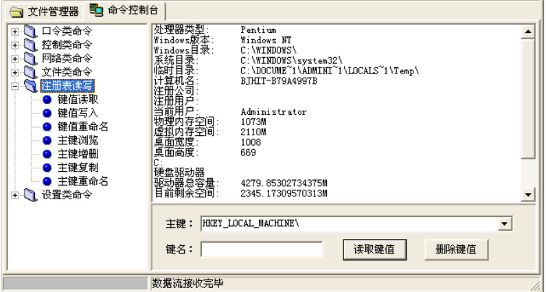“系统信息及口令”:可以查看远程主机的系统信息,开机口令,缓存口令等。可看到非常详细的远程主机信息,这就无异于远程主机彻底暴露在攻击者面前