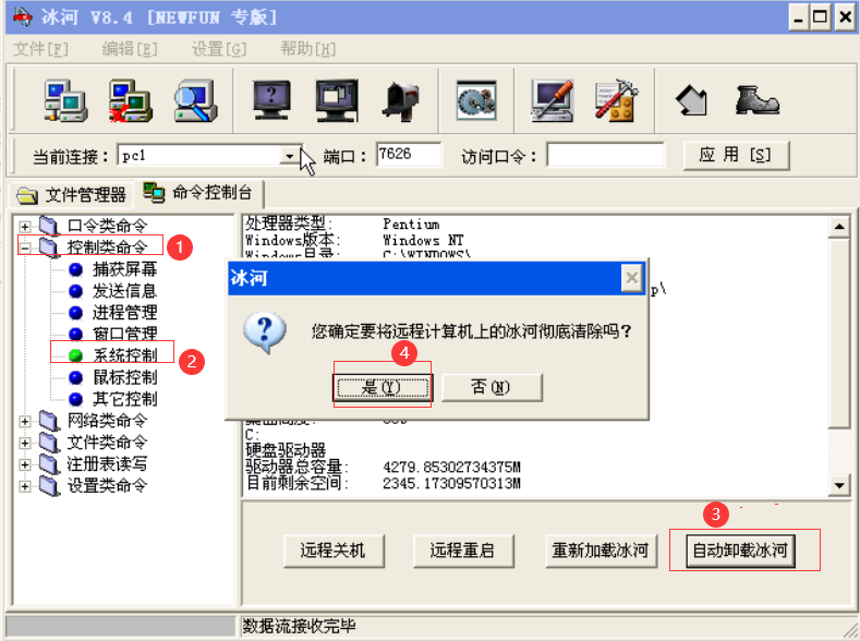 点击“控制类命令”前面的“+”,点击“系统控制”可看到“自动卸载冰河”按钮并点击,在弹出的窗口里面点击“是”,则可以卸载远程主机上的木马