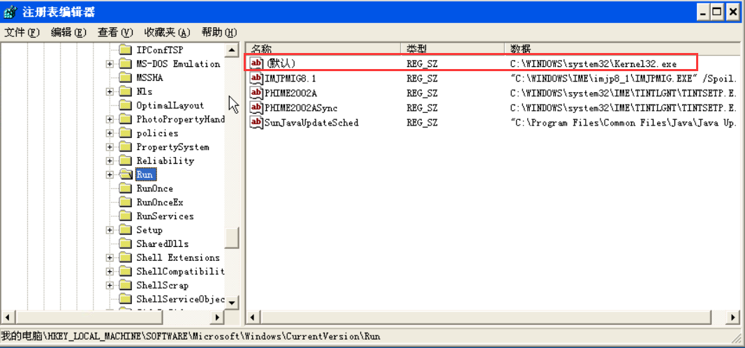 找到路径:HKEY_LOCAL_MACHINE\SOFTWARE\Microsoft\Windows\CurrentVersion\Run, 在目录中发现了一个默认的键值