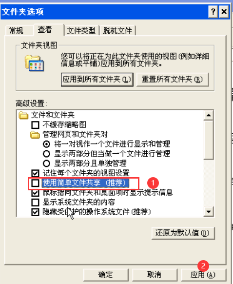 (2)在主机B的“控制面板-工具-文件夹选项-查看-简单的文件共享”去掉选取。