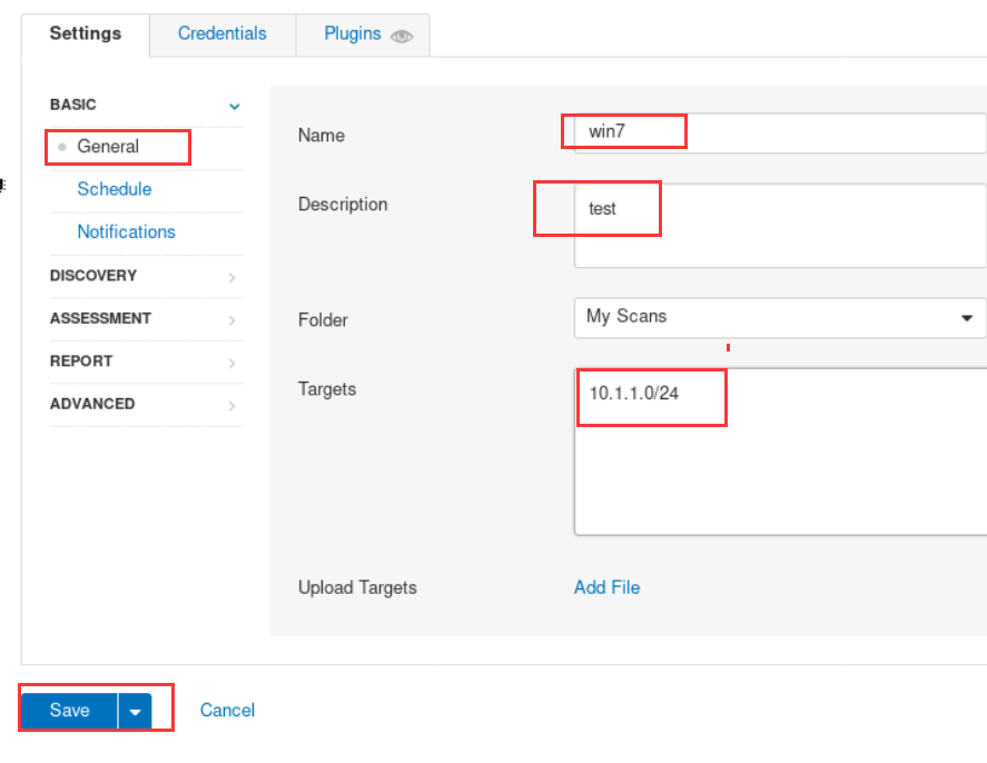 配置扫描信息,主要设置扫描名称、描述和扫描目标三个信息即可,其他配置选择默认,配置完成点击Save。选择对整个10.1.1.0/24网段进行扫描