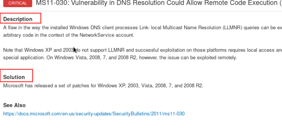 Nessus给出了该漏洞的介绍、风险信息、解决方案等详细信息。Risk information对于攻击者来说非常有用,可以根据Risk information去Google搜索是否存在已知的漏洞利用Exp。
