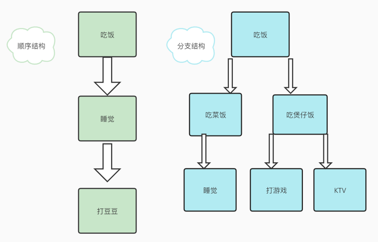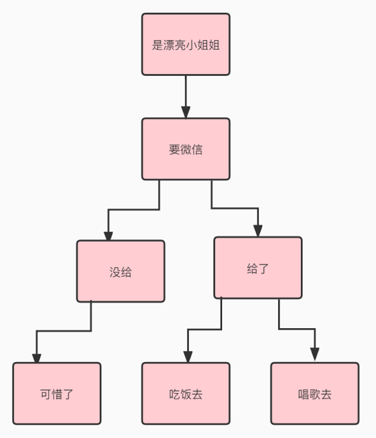 例: 路上看到一个小姐姐,如果很漂亮,上去要微信,两种结果 →1.给了 →2.没给,可惜了 给了微信问是去吃饭还是唱歌,两种结果 →1.吃饭 →2.唱歌 如果转过头发现不漂亮,不好意思认错人了 代码实现: is_beautiful = True # 判断的前置条件 is_success = True # 判断的前置条件 if is_beautiful: print('小姐姐能否加个微信') if is_success: choice = input('小姐姐吃饭还是唱歌?') print('choice') else: print('可惜了!') else: print('不好意思认错人了')