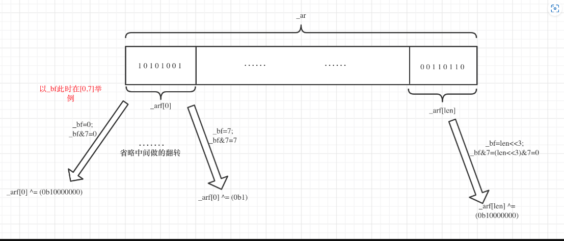 连起来理解,意思就是每8次为一个循环,128分别右移0、1、2、3、4、5、6、7位,将右移后的数字与 _arf[i]进行异或翻转,相当于每一位都进行一次翻转,如下图