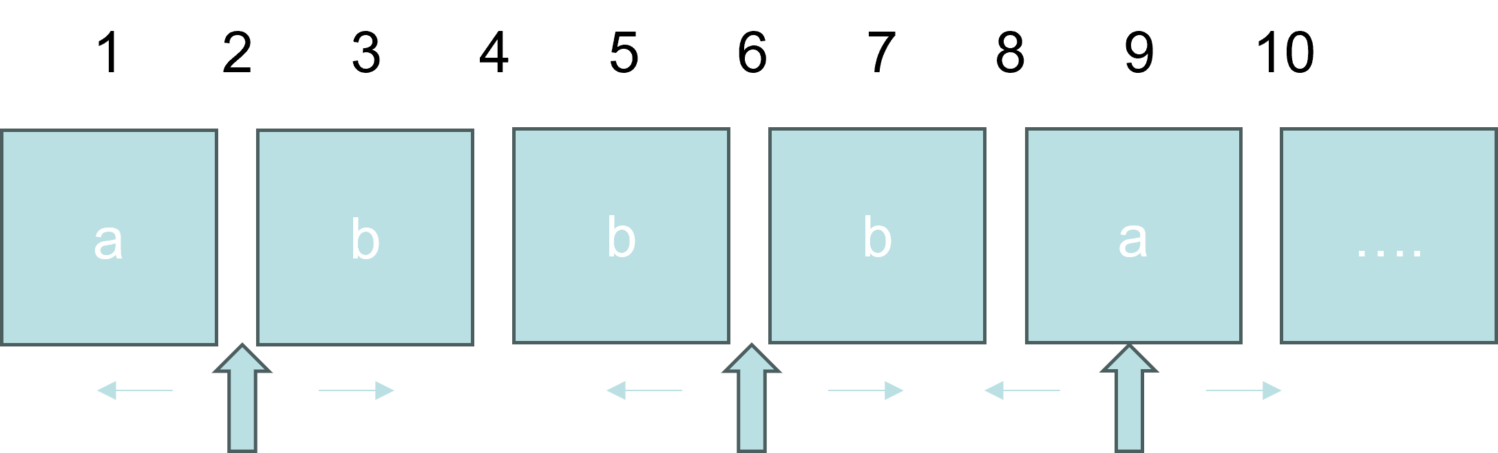 2. 字符中间的空位(诸如序号1 $a$ 与序号3 $b$ 中间序号为2的空位)