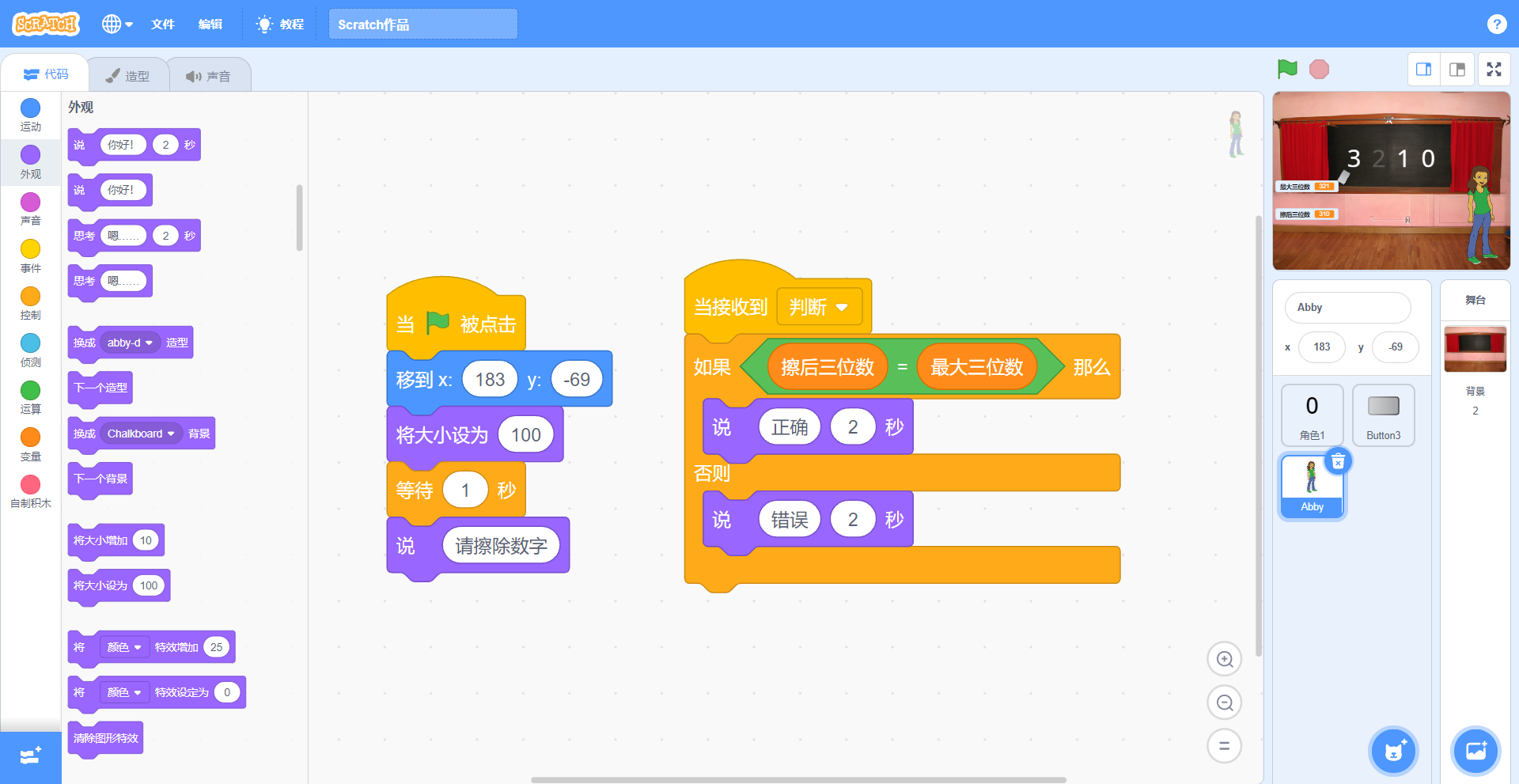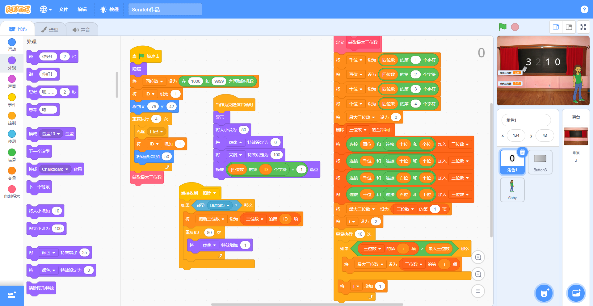 1). 点击绿旗,黑板上显示一个随机的四位数,如图所示;