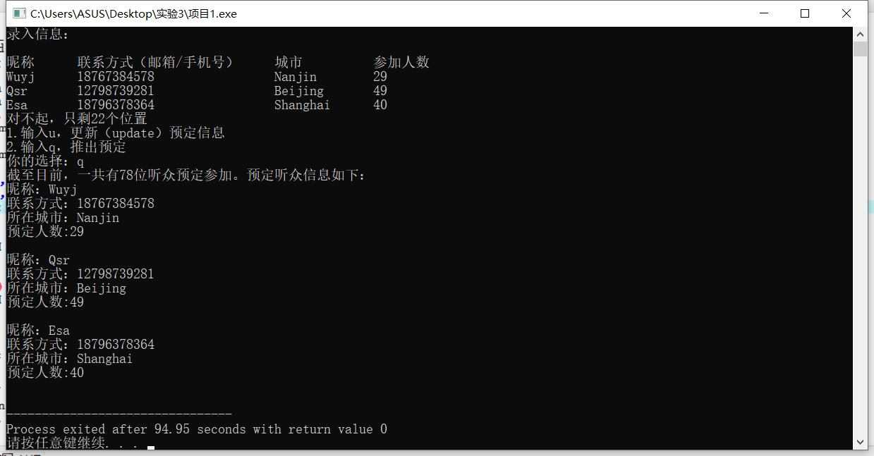 #include"info.hpp" #include<iostream> #include<vector> #include<string> #include<iomanip> using namespace std; int main(){ string s1,s2,s3; const int n=100; char a; int n1=0,n2,n3; vector <Info> audience_info_list; cout<<"录入信息:"<<endl<<endl; cout<<"昵称 "<<"联系方式(邮箱/手机号) "<<"城市 "<<"参加人数 "<<endl; while(Info::num<=n){ cin>>s1>>s2>>s3>>n1; Info f1(s1,s2,s3,n1); audience_info_list.push_back(f1); Info::num=Info::num+n1; if(Info::num>n){ n2=n-(Info::num-n1); cout<<"对不起,只剩"<<n2<<"个位置"<<endl; cout<<"1.输入u,更新(update)预定信息"<<endl; cout<<"2.输入q,推出预定"<<endl; cout<<"你的选择:"; cin>>a; if(a=='q'){ Info::num=Info::num-n1; break; } else if(a=='u'){ Info::num=Info::num-n1; continue; } else cout<<"输入错误,请重新输入"<<endl; } } cout<<"截至目前,一共有"<<Info::num<<"位听众预定参加。预定听众信息如下:"<<endl; for(n3=0;n3<audience_info_list.size();n3++) audience_info_list[n3].print(); }