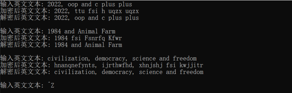 #include "textcoder.hpp" #include <iostream> #include <string> void test() { using namespace std; string text, encoded_text, decoded_text; cout << "输入英文文本: "; while (getline(cin, text)) { encoded_text = TextCoder(text).get_ciphertext(); // 这里使用的是临时无名对象 cout << "加密后英文文本:\t" << encoded_text << endl; decoded_text = TextCoder(encoded_text).get_deciphertext(); // 这里使用的是临时无名对象 cout << "解密后英文文本:\t" << decoded_text << endl; cout << "\n输入英文文本: "; } } int main() { test(); }