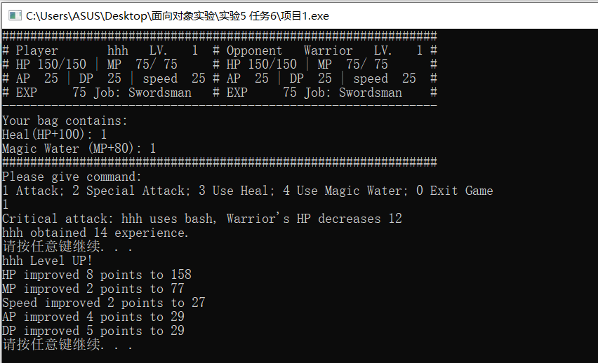 //======================= // main.cpp //======================= // main function for the RPG style game #include <iostream> #include <string> #include "swordsman.h" using namespace std; int main() { string tempName="0"; bool success = 0; //flag for storing whether operation is successful cout << "Please input player's name: "; cin >> tempName; // get player's name from keyboard input player* human;// use pointer of base class, convenience for polymorphism human = new swordsman(1, tempName); int tempJob; // temp choice for job selection do { cout << "Please choose a job: 1 Swordsman, 2 Archer, 3 Mage" << endl; cin >> tempJob; system("cls"); // clear the screen switch (tempJob) { case 1: delete human; human = new swordsman(1, tempName); // create the character with user inputted name and job success = 1; // operation succeed break; default: break; // In this case, success=0, character creation failed } } while (success != 1); // so the loop will ask user to re-create a character int tempCom; // temp command inputted by user int nOpp = 0; // the Nth opponent for (int i = 1; nOpp < 5; i += 2) // i is opponent's level { nOpp++; system("cls"); cout << "STAGE" << nOpp << endl; cout << "Your opponent, a Level " << i << " Swordsman." << endl; system("pause"); swordsman enemy(i, "Warrior"); // Initialise an opponent, level i, name "Junior" human->reFill(); // get HP/MP refill before start fight while (!human->death() && !enemy.death()) // no died { success = 0; while (success != 1) { showinfo(*human, enemy); // show fighter's information cout << "Please give command: " << endl; cout << "1 Attack; 2 Special Attack; 3 Use Heal; 4 Use Magic Water; 0 Exit Game" << endl; cin >> tempCom; switch (tempCom) { case 0: cout << "Are you sure to exit? Y/N" << endl; char temp; cin >> temp; if (temp == 'Y' || temp == 'y') return 0; else break; case 1: success = human->attack(enemy); human->isLevelUp(); enemy.isDead(); break; case 2: success = human->specialatt(enemy); human->isLevelUp(); enemy.isDead(); break; case 3: success = human->useHeal(); break; case 4: success = human->useMW(); break; default: break; } } if (!enemy.death()) // If AI still alive enemy.AI(*human); else // AI died { cout << "YOU WIN" << endl; human->transfer(enemy); // player got all AI's items } if (human->death()) { system("cls"); cout << endl << setw(50) << "GAME OVER" << endl; delete human; // player is dead, program is getting to its end, what should we do here? system("pause"); return 0; } } } delete human; // You win, program is getting to its end, what should we do here? system("cls"); cout << "Congratulations! You defeated all opponents!!" << endl; system("pause"); return 0; }