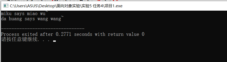 #include<iostream> #include"pets.hpp" void play(MachinePets &obj){ std::cout<<obj.get_nickname()<<" says "<<obj.talk()<<std::endl; } void test(){ PetCats cat("miku"); PetDogs dog("da huang"); play(cat); play(dog); } int main(){ test(); }