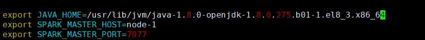 第一个很明显是java安装路径,第二个是确定master是谁,这里我是将ip映射为主机名了(每台机器都要进行相同映射),可以在/etc/hosts中配置,第三个就是master端口配置了。