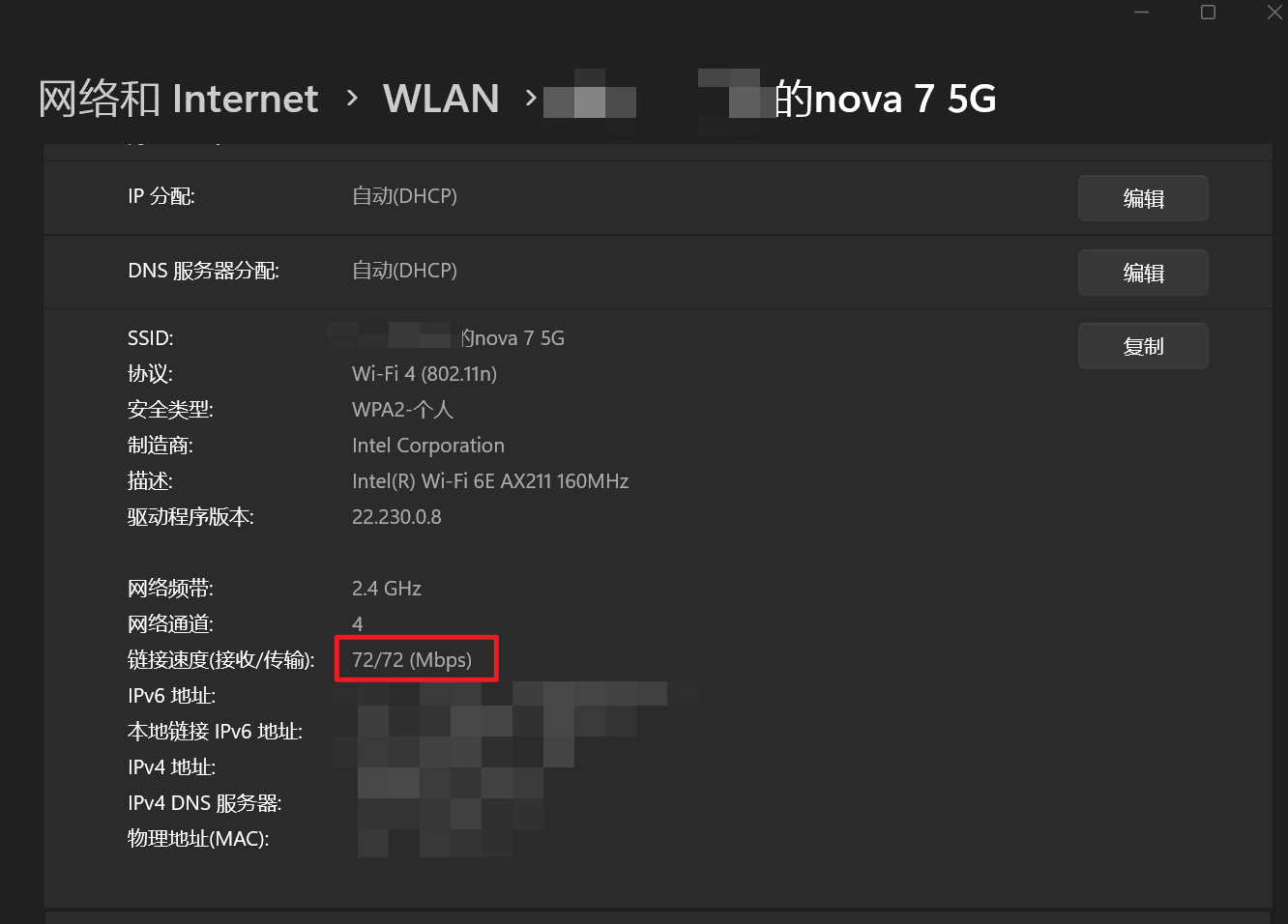 一. 在电脑连接手机热点的时候,查询网络属性,找到网络频带是2.4 GHz,带宽是72 (Mbps):