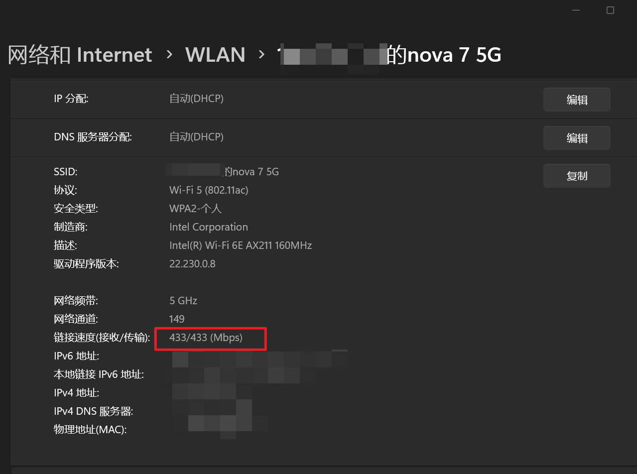 再在电脑上查询网络属性,可以看到电脑带宽也变成了433 (Mbps):
