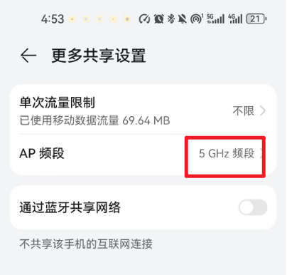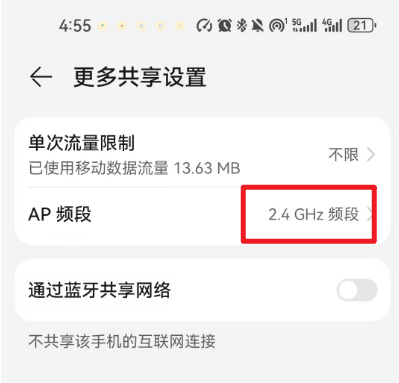 查找原因,发现是手机热点页面中AP频带设置的原因,AP频带设置成了2.4 GHz:
