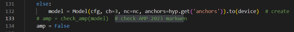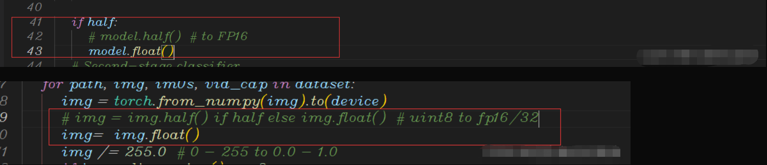 然后,你就会发现validation时会出现P/R/map全部为0。然后你就继续在train.py里面搜索half关键字,把所有有.half()变为.float(),如下图: