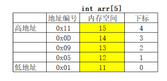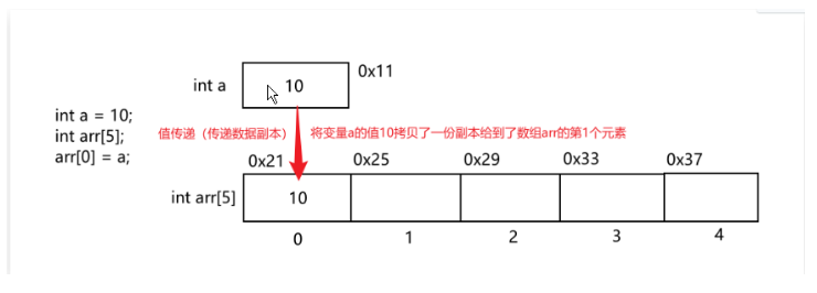 int arr[5]:在内存中开辟连续的5块空间,每一块空间的大小是4个字节。