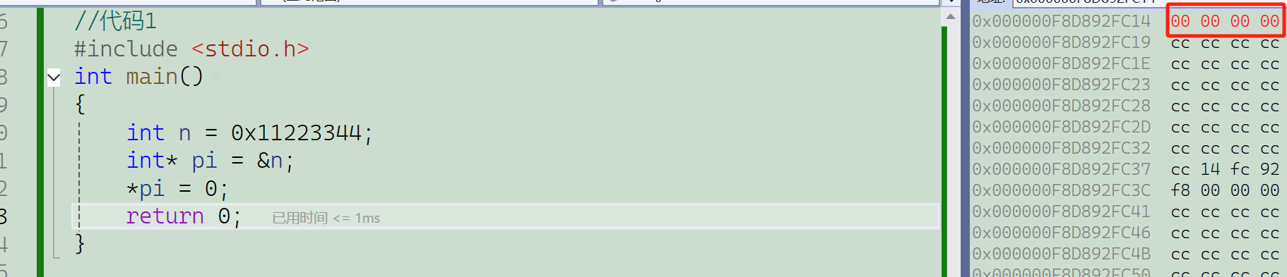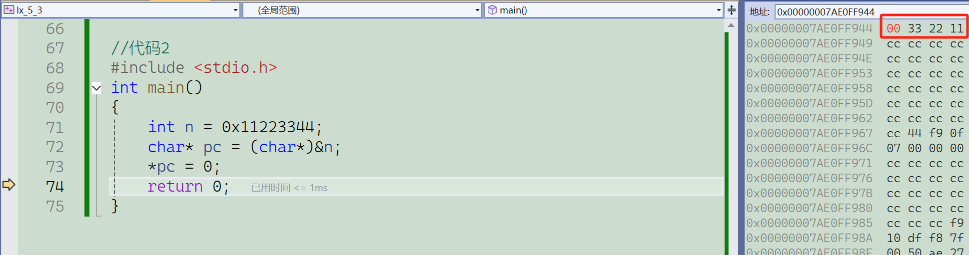 --通过调试观察其内存变化我们可以发现,代码1将n的4个字节全部改为0,但是代码2只第一个字节改为0.