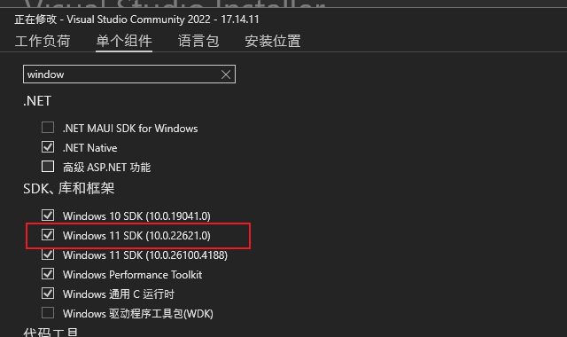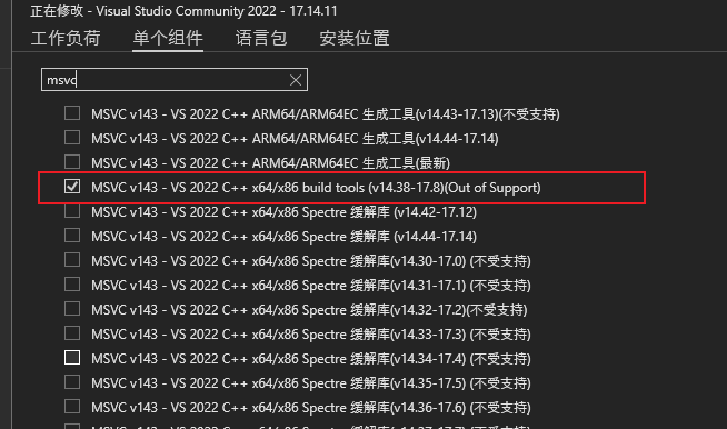 当然最好是将VS2022更新到17.14版本,然后windowSDK版本需要勾选10.0.22621.0;MSVC版本选到14.38.33130