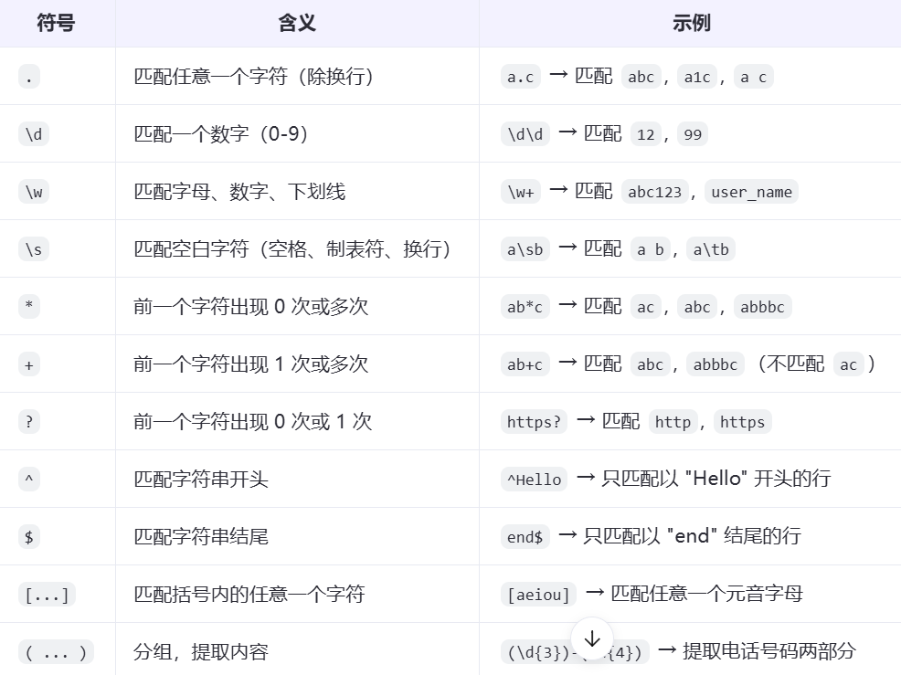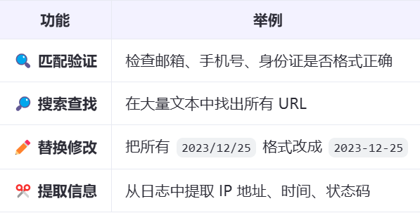 正则表达式 = 一套规则语言,用来描述你想要找的文本模式