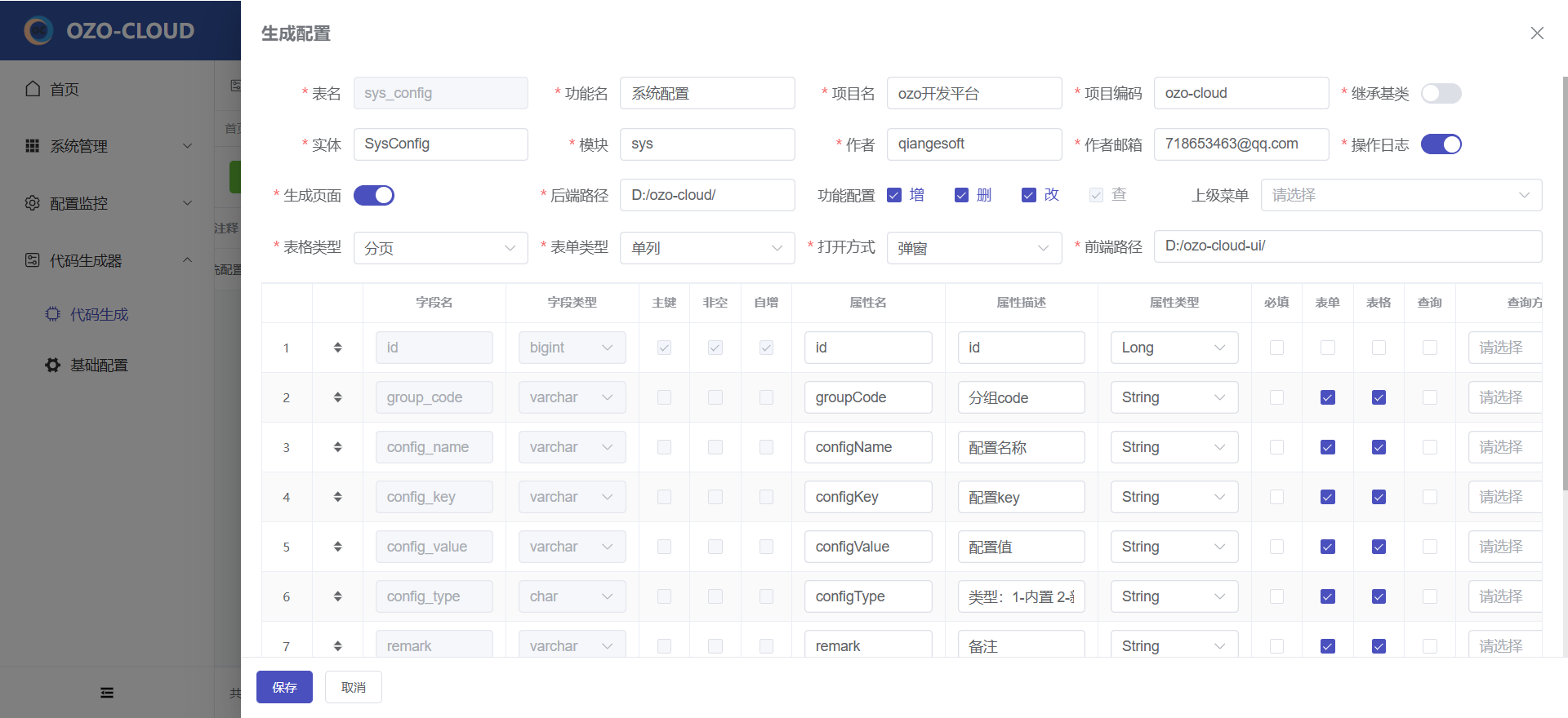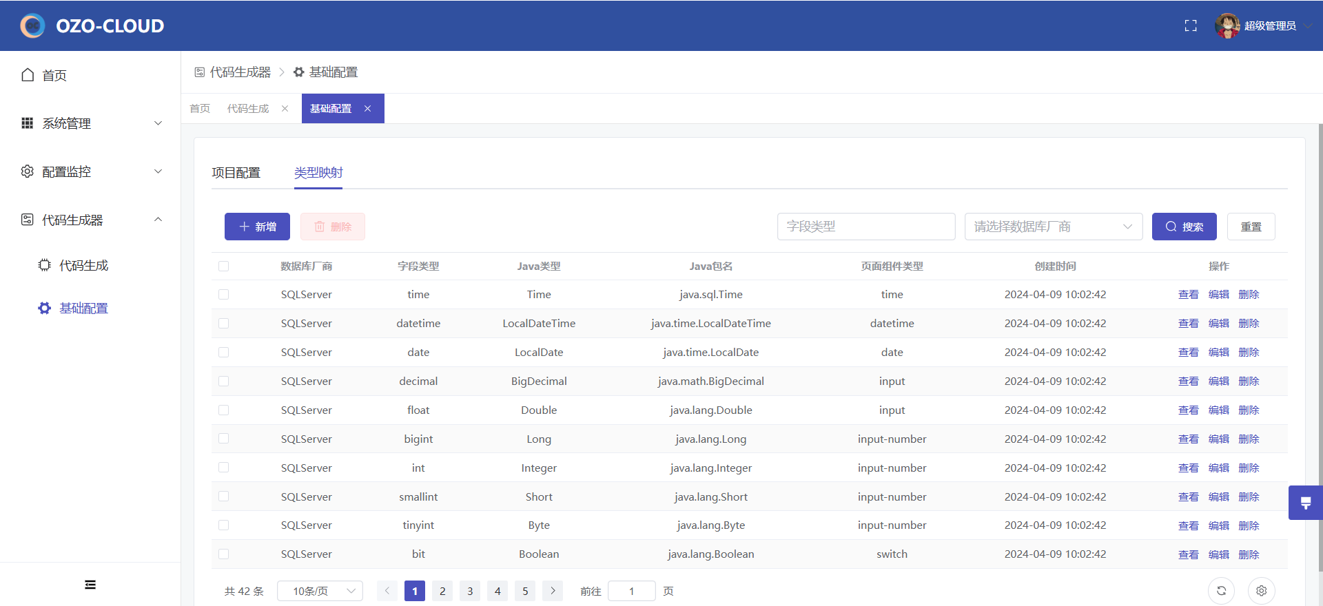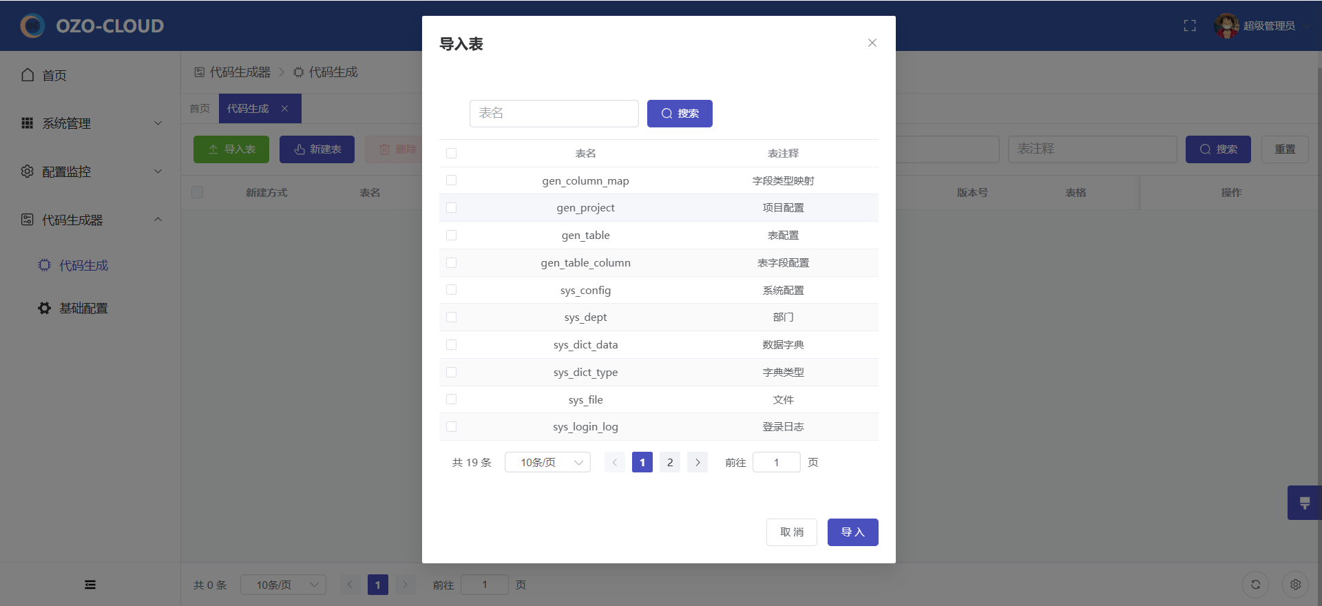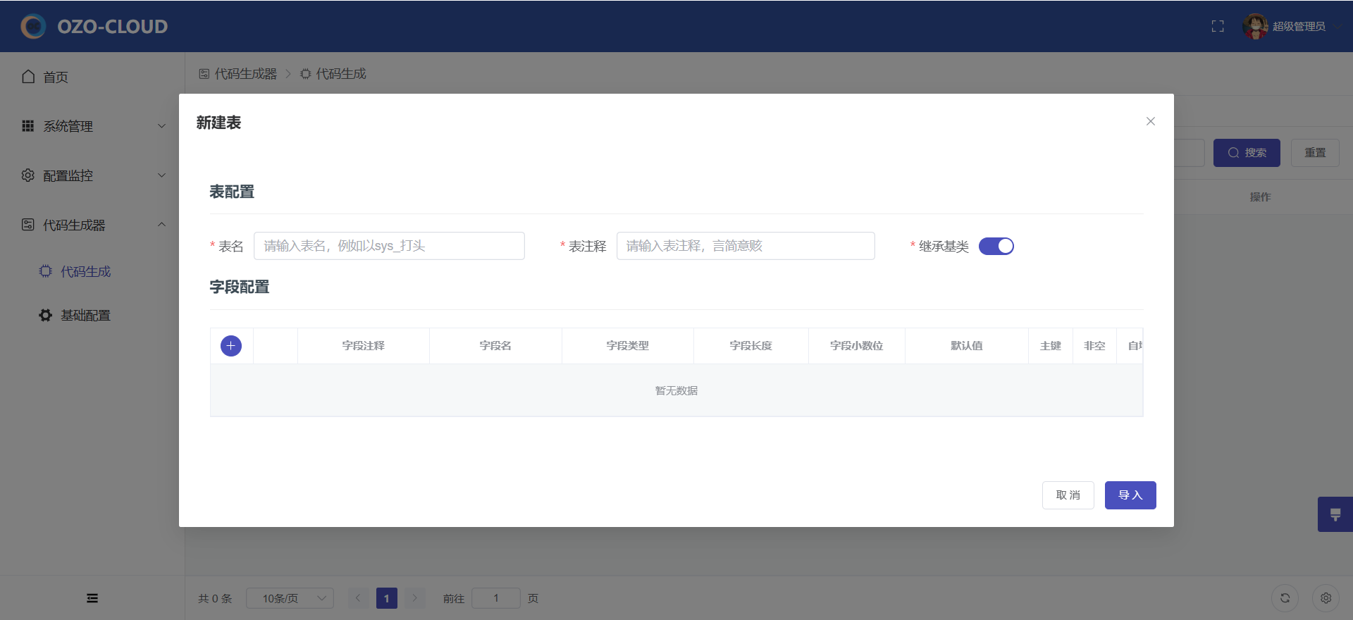 | 代码生成 | 导入、新建表、生成配备、代码生成、删除 |