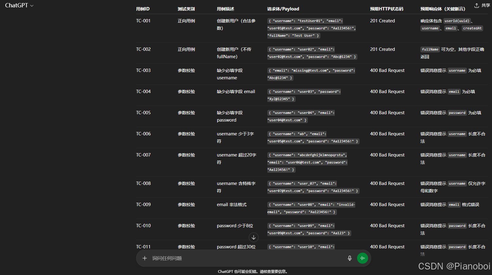 `用例ID` | `测试类别` | `用例描述` | `请求体/Payload` | `预期HTTP状态码` | `预期响应体(关键断言)`