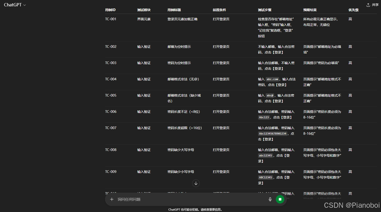 这是最常见的场景,也是最适合新手入门的练习。传统方式下,我们可能会凭经验列出几个正反用例,但很容易遗漏细节。现在,我们让AI来系统地完成这件事了,后面我就用ChatGPT来做示范。