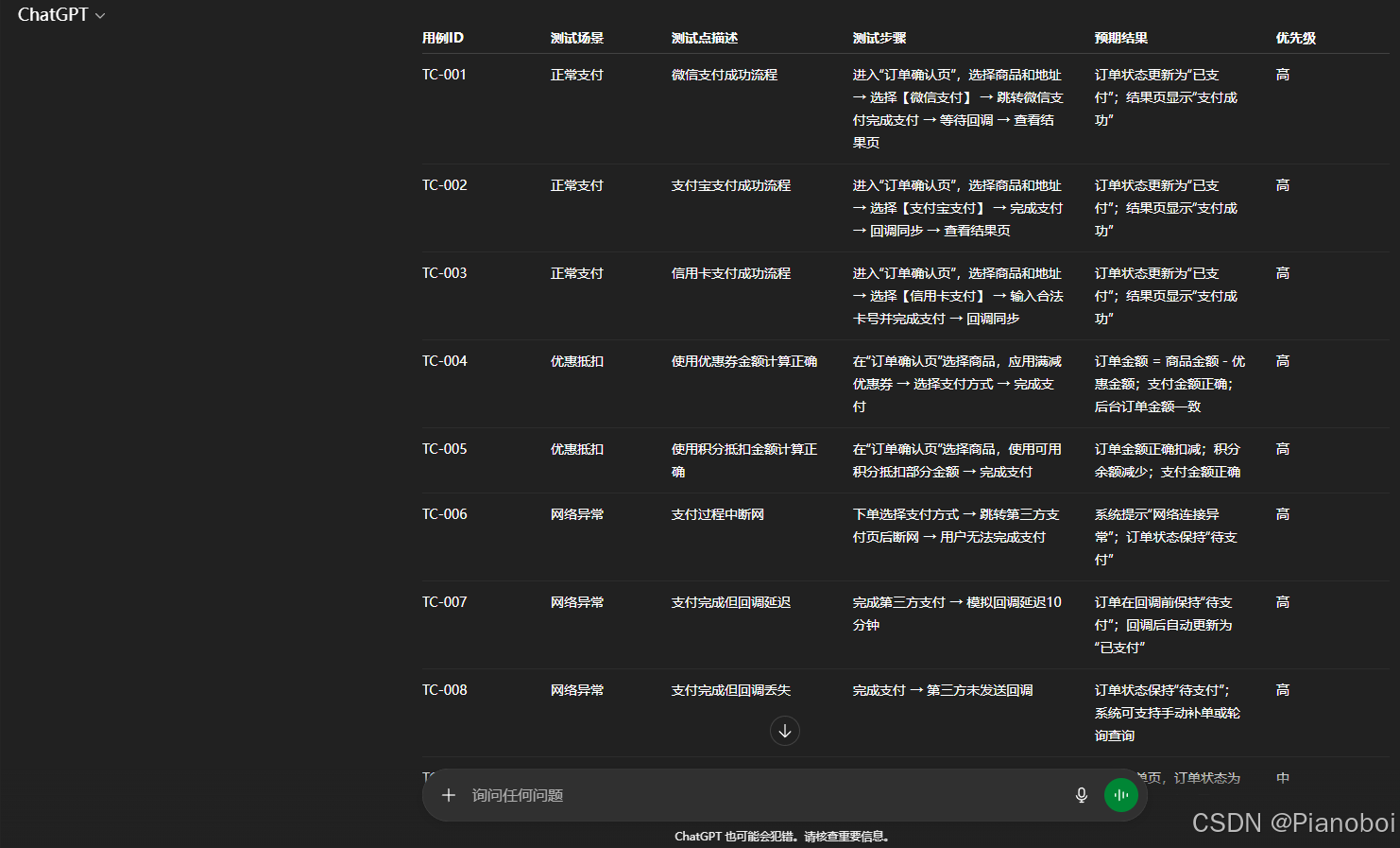 问题与优化:AI不了解你系统的具体实现。比如“回调延迟”和“回调丢失”的测试,需要研发配合进行模拟,AI无法告诉你具体如何操作。解决方案:在拿到这类用例后,我会立即将其转化为与开发人员的“沟通清单”。我会拿着